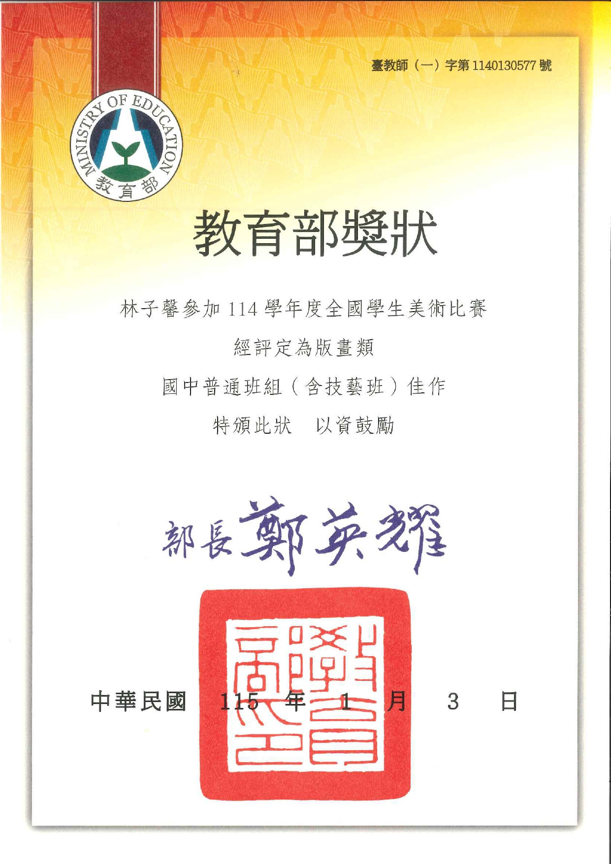 林子馨同學平日在藝術領域勤奮耕耘,此次能從各縣市頂尖作品中脫穎而出,實屬不易。全體師生聞訊同感欣慶,