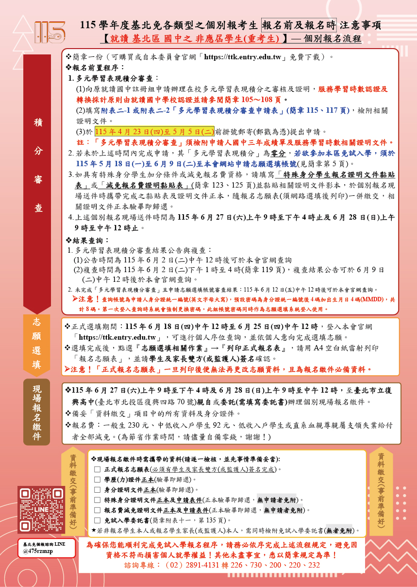 (二)請協助提供學生「115學年度基北區高級中等學校免試入學個別報名流程圖」(附件2),並提醒學生志願選填及現