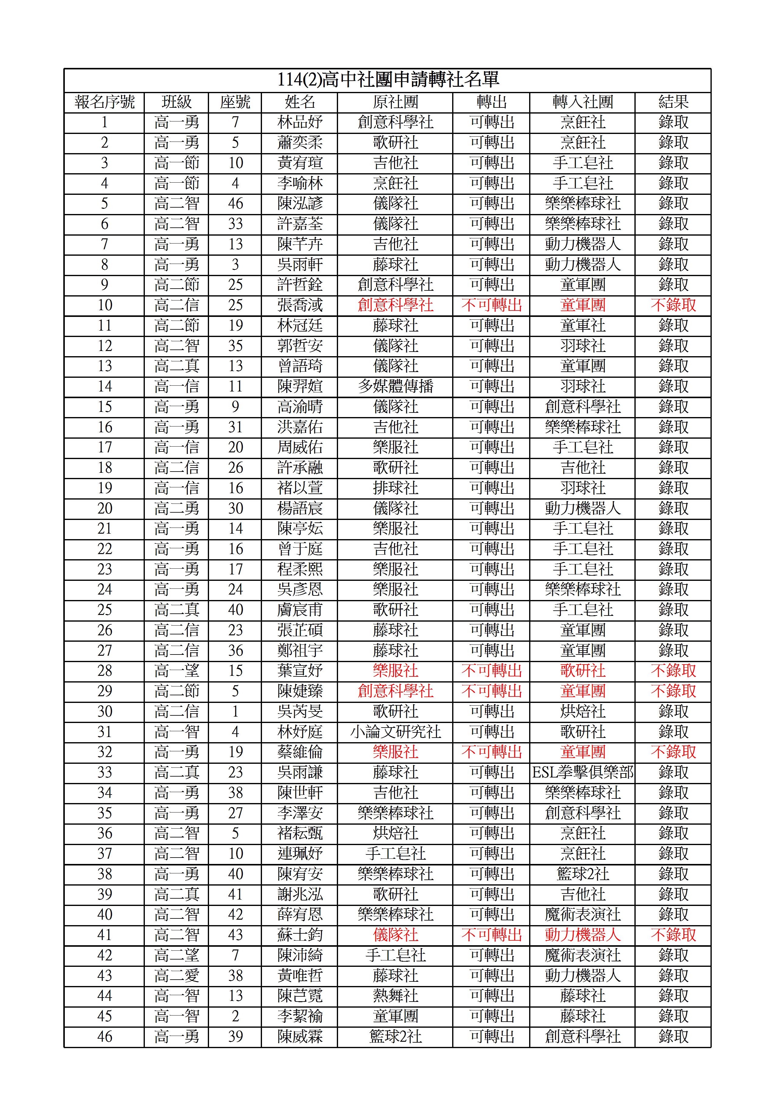 受理)。114年8月27日(三)於校網公告錄取名單(請確認自己錄取之社團,並確認教室位置,開課後