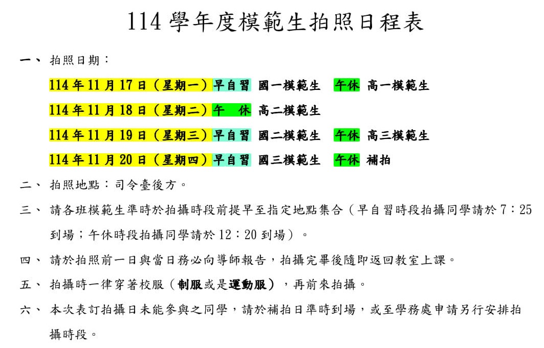 一、依據本市114學年度模範生甄選實施計畫辦理。